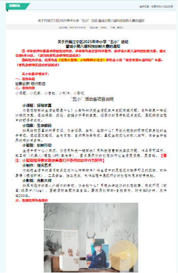 2025年9月,为响应全国科普日号召,我校以一场科技比赛、一次作品展示、一组实践观察为主线,开展为期一个月的科技素养提升行动。活动覆盖全校1000余名师生,通过竞赛、实践、观察三维联动,累计收到科创作80件,评选出区级参赛作品15项。