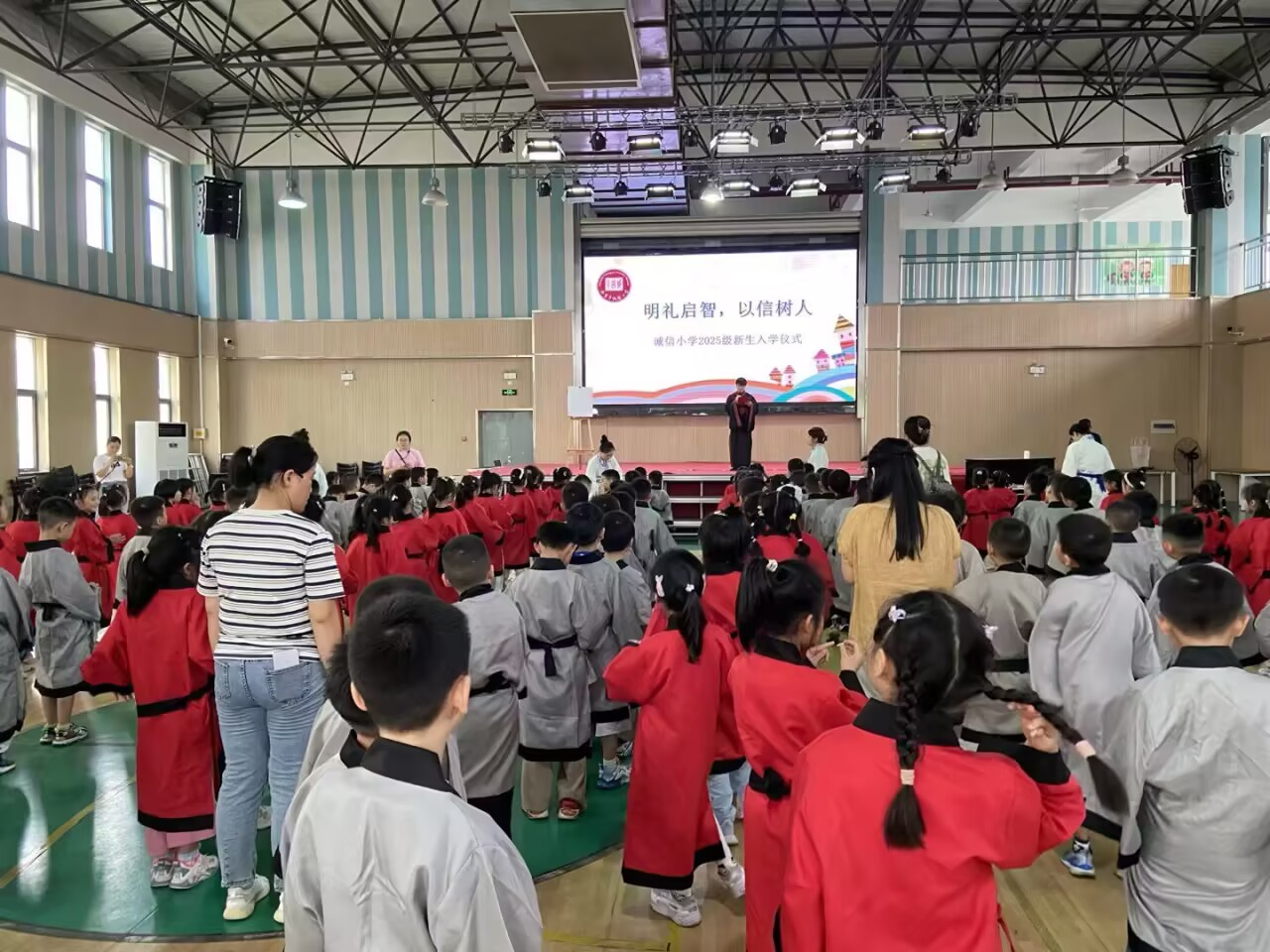 上午9时,伴随着悠扬的古乐,入学典礼在“开笔礼”中拉开帷幕。孩子们在张老师的引导下,认真整理衣冠,学习“先正衣冠,后明事理”的传统礼仪。