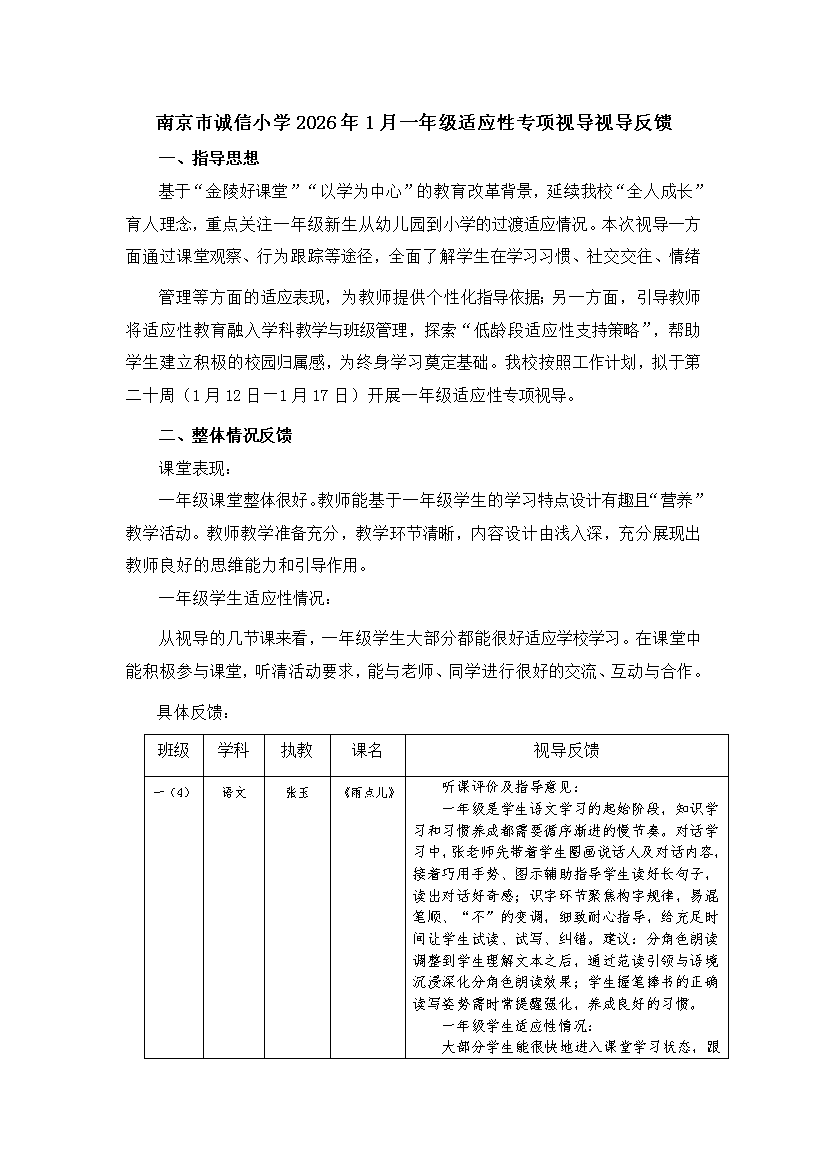 南京市诚信小学2026年1月一年级适应性专项视导视导反馈